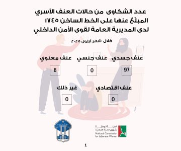 عدد الشكاوى من حالات العنف الأسري المبلّغ عنها على الخط الساخن 1745 لدى المديرية العامة لقوى الأمن الداخلي لشهر أيلول 2025. شمل هذا التقرير الشهري عدد الإتصالات المتعلّقة بحالات العنف الجسدي والجنسي والنفسي والإقتصادي التي تتلقاها القوى الأمنية عبر الخط الساخن 1745 والتي يتمّ التبليغ عنها من قبل الضحية أو أفراد الأسرة أو كل من يشهد عليها، بالإضافة إلى تحديد هوية الجاني أو الجانية بالنسبة إلى الضحية.